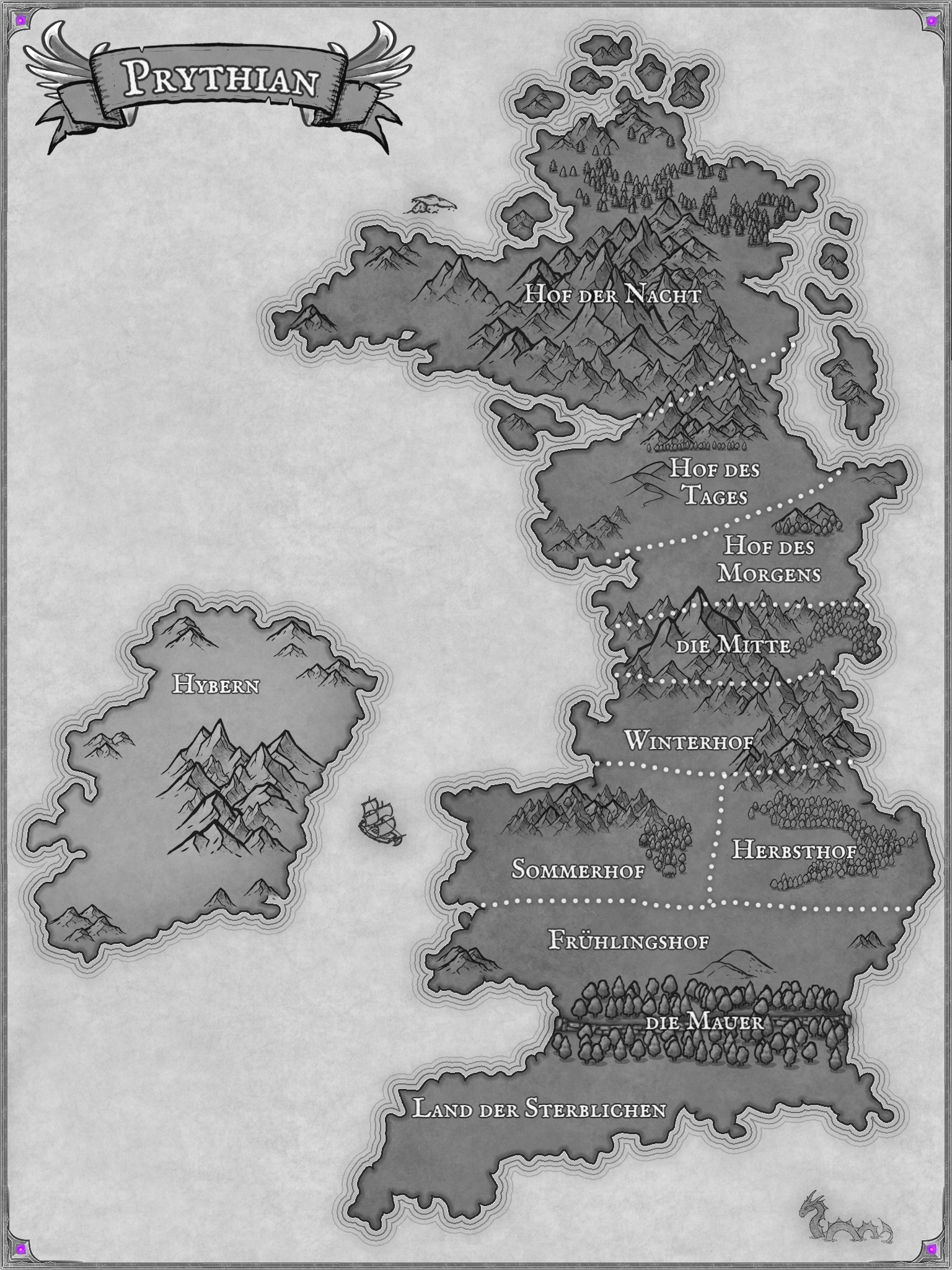 Die sieben Höfe, so unterschiedlich sie auch sein mögen, haben alle eines gemeinsam: Sie gehören zum Land Prythian. Unterteilt in sieben Höfe und das neutrale Gebiet der Mitte sind dort nicht nur Herrscherresidenzen, Städte und Dörfer zu finden, sondern auch ganz spezielle Kultorte, religiöse Stätten oder landschaftliche besondere Orte.